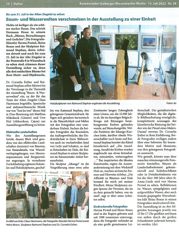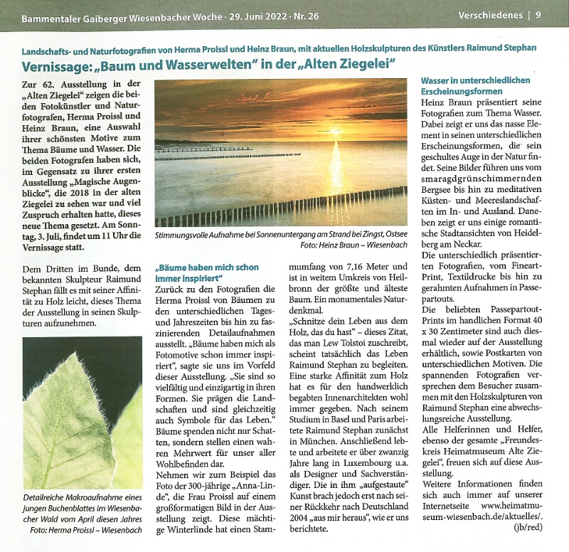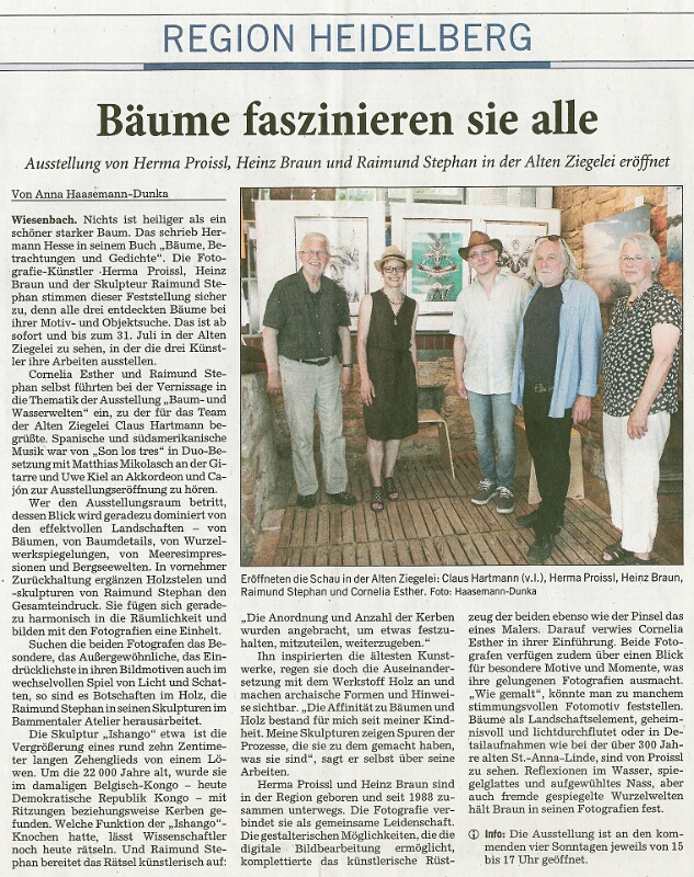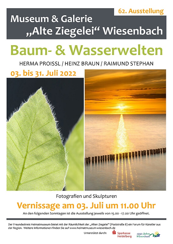 Ausstellung Baum- & Wasserwelten Wir laden Sie herzlich ein zu unserer Ausstellung: Baum- und Wasserwelten. Vernissage am 03 Juli um 11 Uhr, in der Alten Ziegelei, Poststraße 8, in 69257...